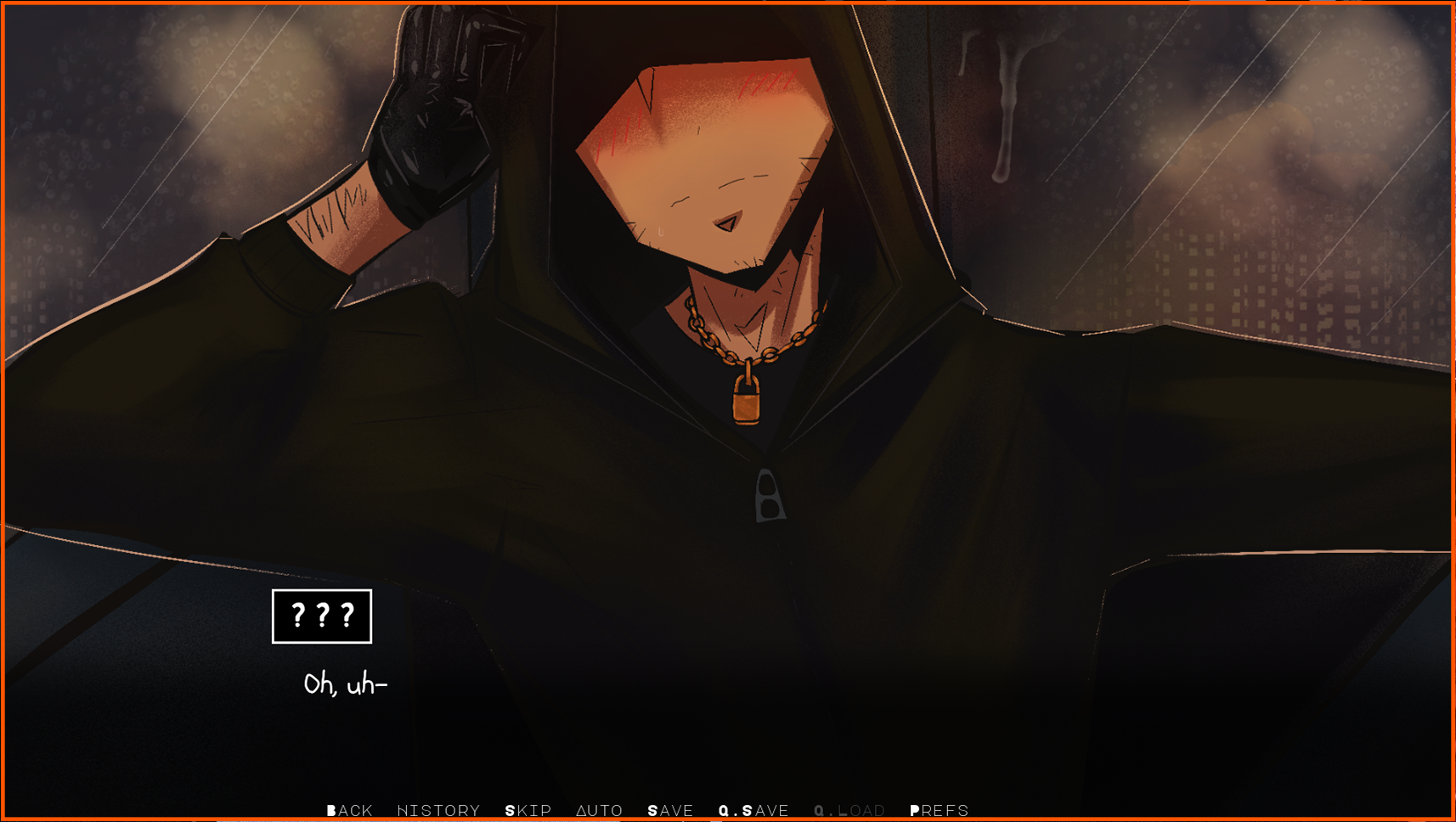 Customisable protagonist- choose name, pronouns, chest and genitals, with the option not to specify. Protagonist will appear in CGs as a grey "y/n" style character.