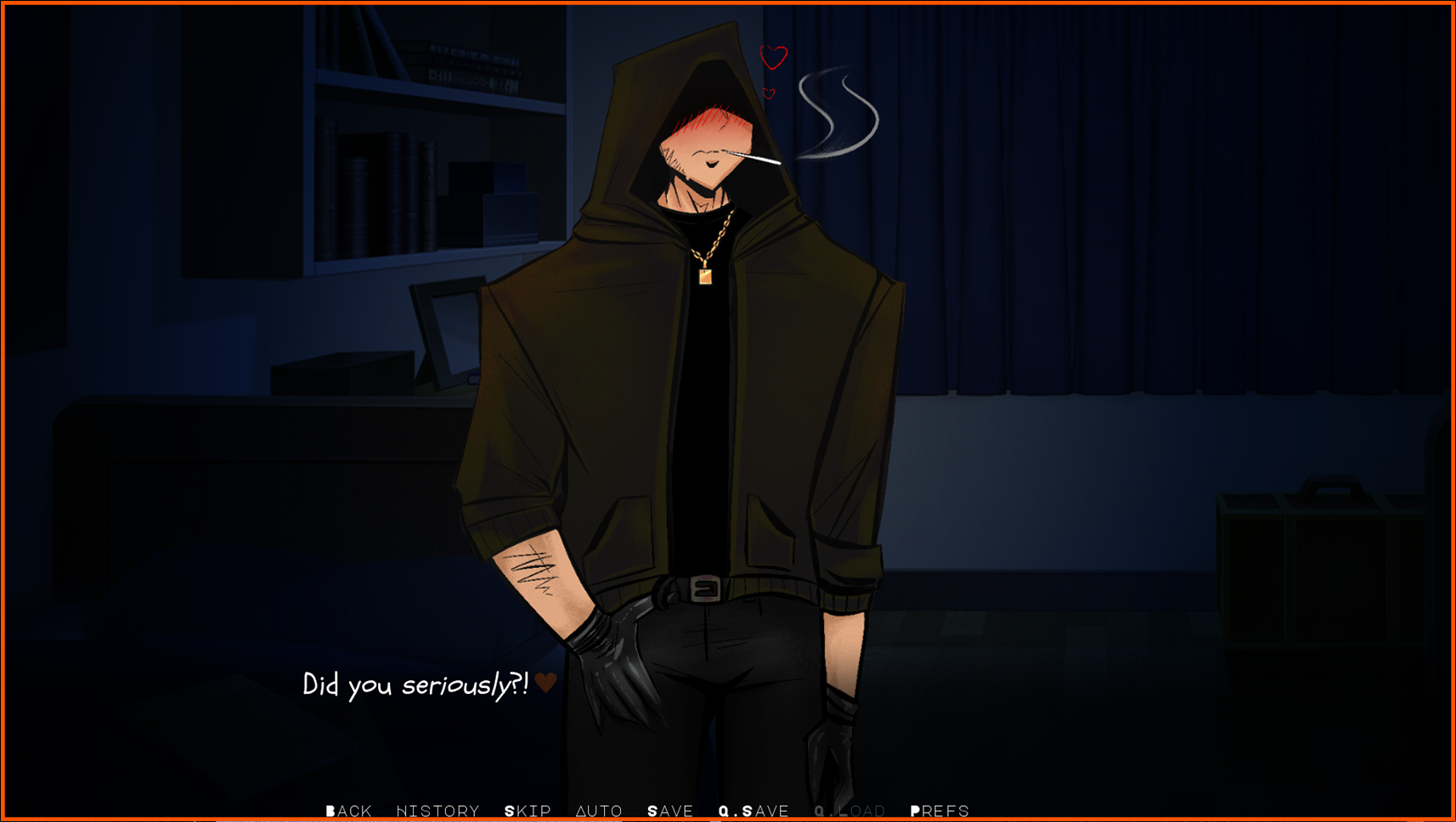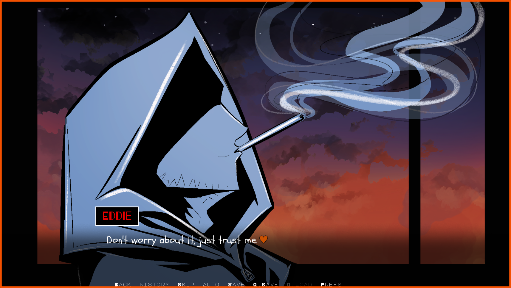 The writing was hot, Eddie was equal parts creepy/puppyboy/chainsmoking 29 year old blue collar man in the most realistic sense, and the MC was hilarious. 100 billion extra bonus points for allowing the MC to be a smoker. Not enough dating sims especially ones where you can play as a female MC allow you to smoke a dang cigarette even if the love interest(s) are going through 8 packs a day.